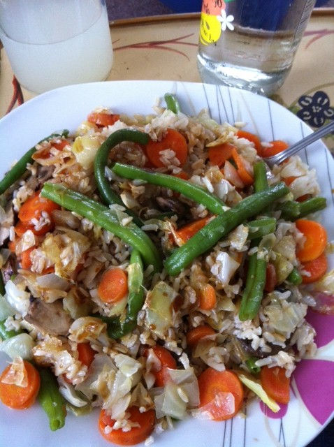 Came home and treated myself to a lovely gigantic plate of sauteed vegetables (cabbage, green beans, carrots, portabella mushrooms, and purple onion) with a bit of brown rice and lots of soy sauce...mmmmmmm....